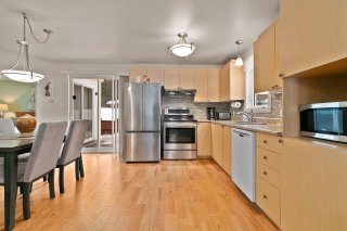 Cuisine / Salle à manger: Grande fenêtre située au-dessus de l'évier double procurant une belle luminosité naturelle Beau luminaire suspendu avec chaîne au-dessus de la table à manger Espace dédié pour le micro-ondes Dosseret décoratif en céramique et verre Beaucoup d'armoires et de rangement Porte-patio menant à la cour arrière et laissant entrer une abondante lumière naturelle Plancher de bois